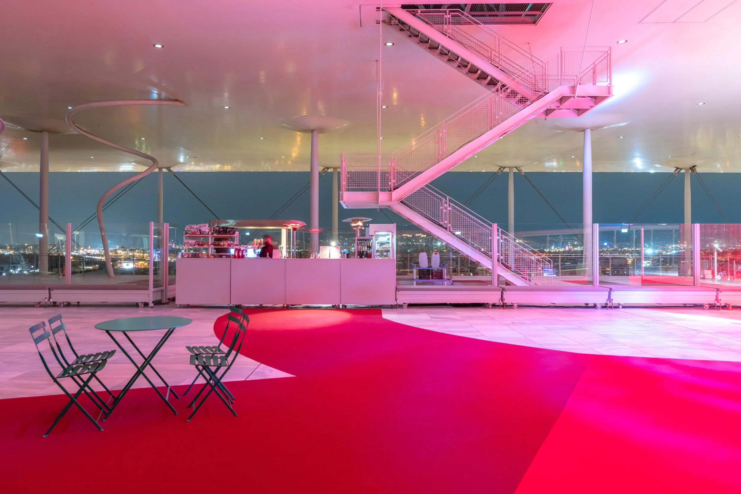 A performative relationship is established between the elements, the visitors and the existing space that contains them, activating the entire terrace. The atmosphere is enhanced and expanded by a complementing play of lights.